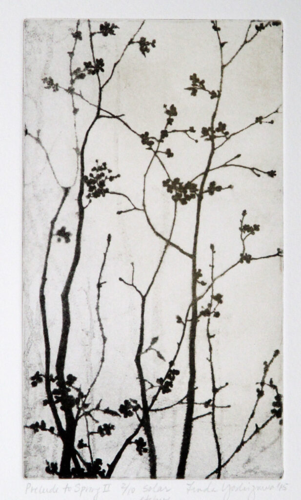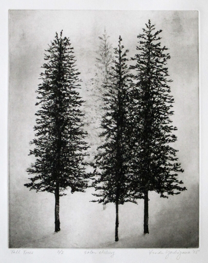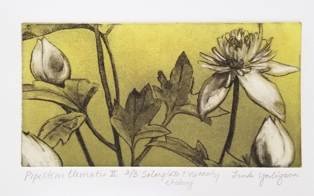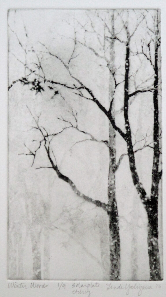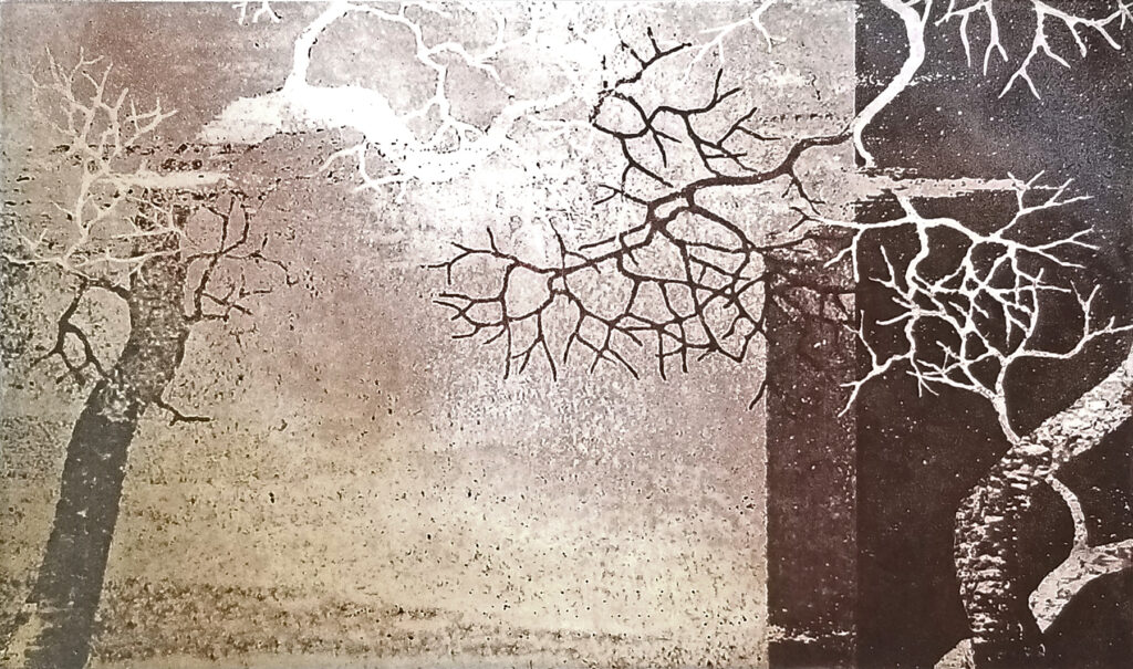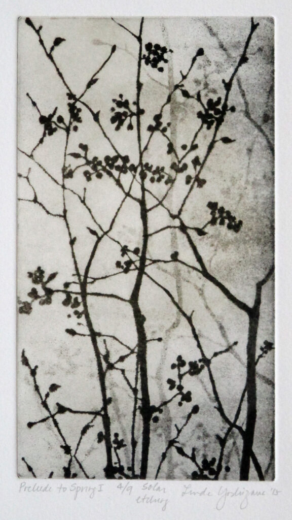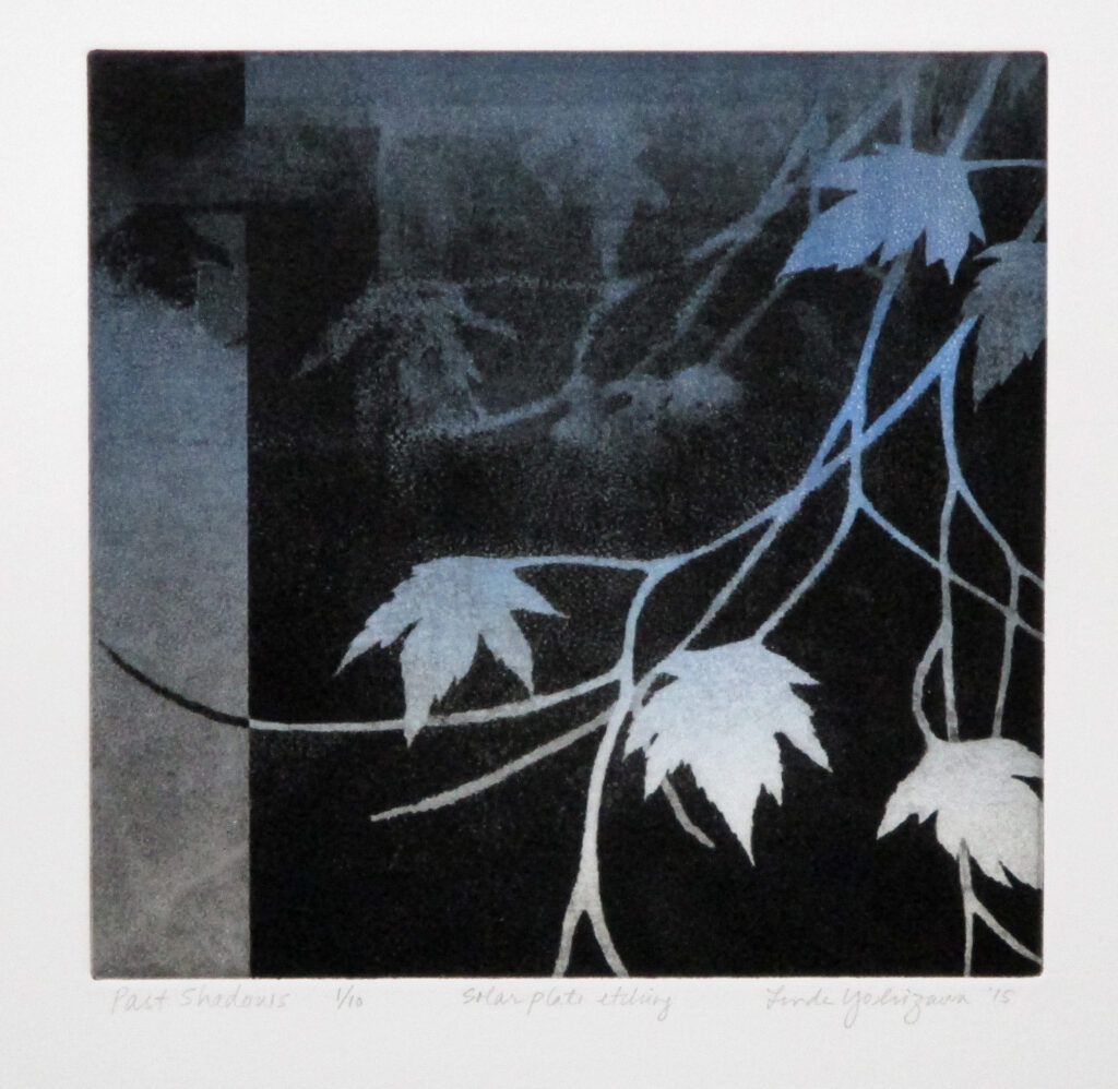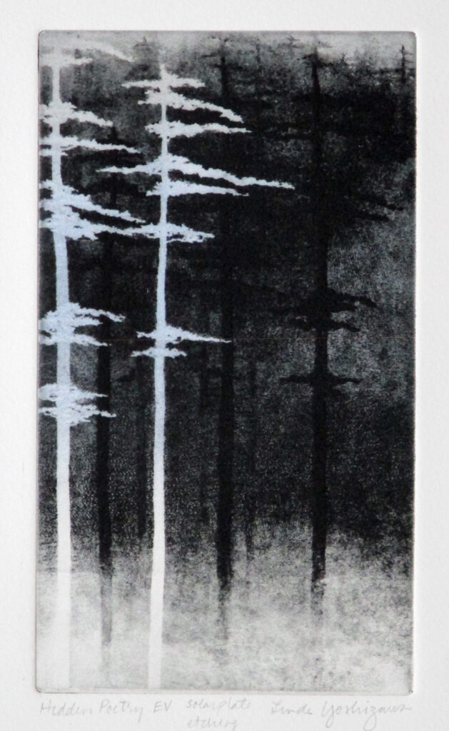Solarplates are metal plates which are coated with a light-sensitive polymer emulsion. A black and white transparency is placed over the plate and exposed to ultraviolet light to harden the emulsion. After the dark (soft) areas are washed out with water the solarplate is inked and printed using the etching press.