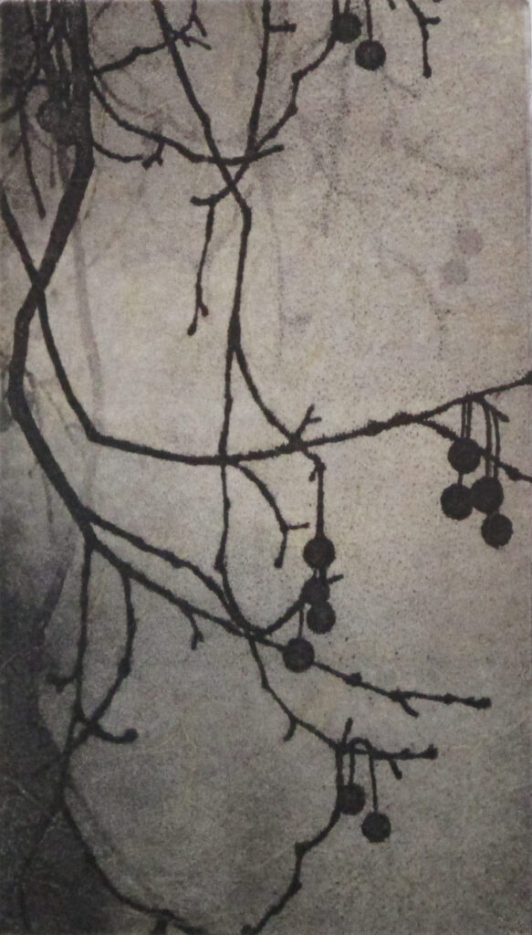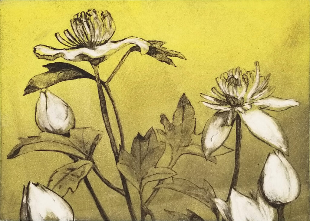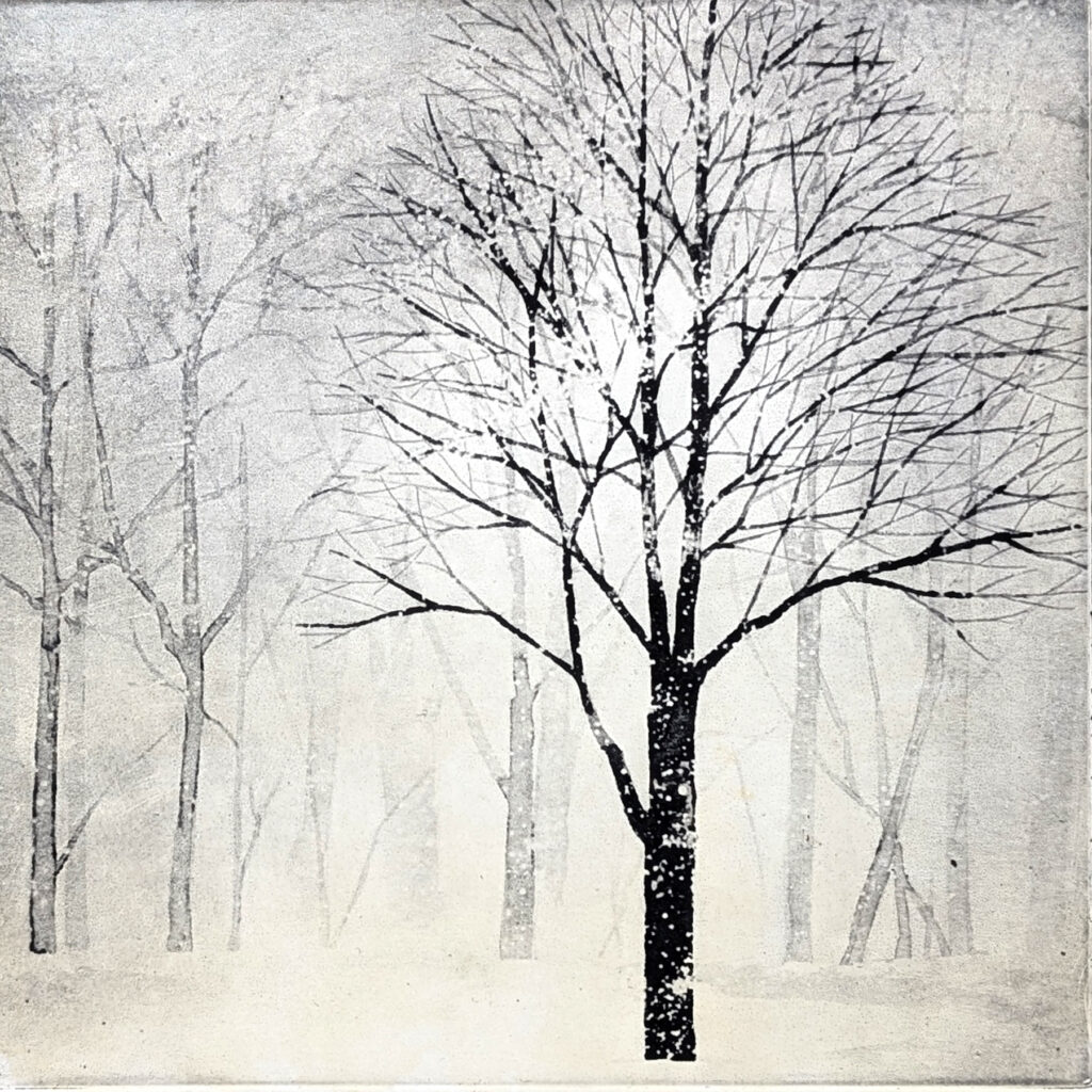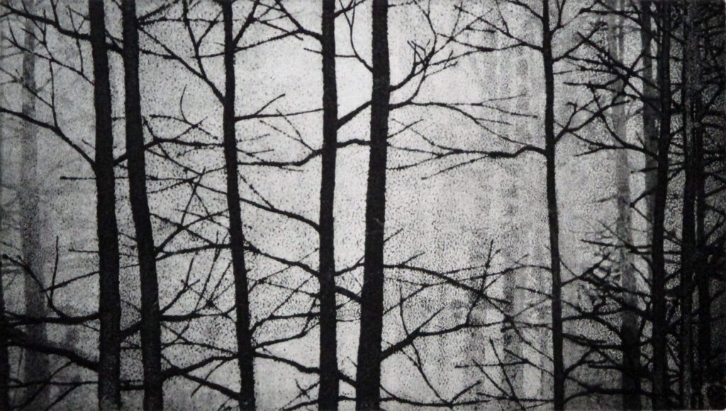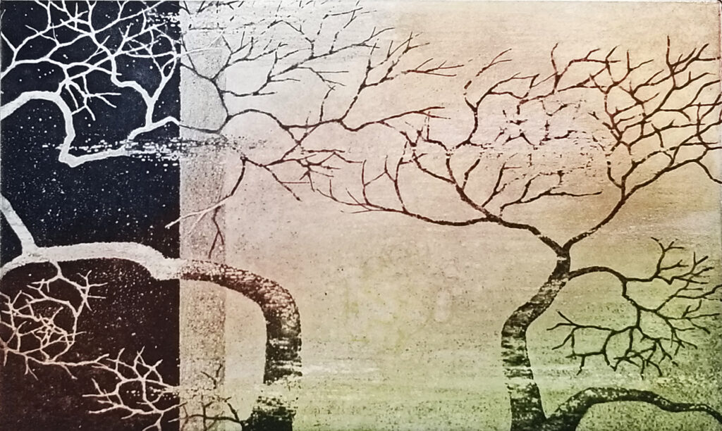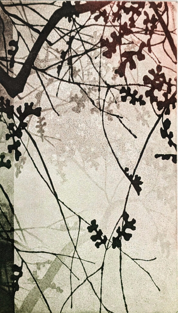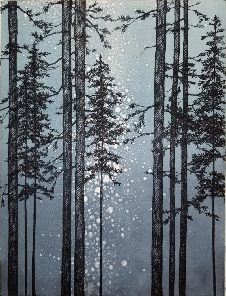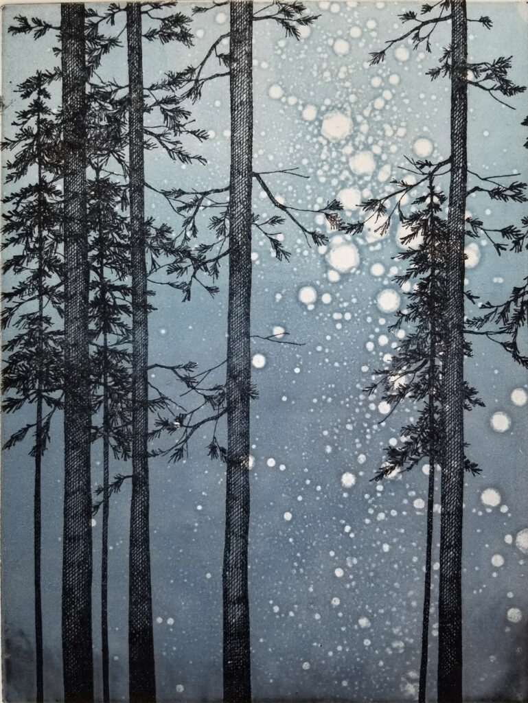 Solarplates are metal plates which are coated with a light-sensitive polymer emulsion. A black and white transparency is placed over the plate and exposed to ultraviolet light to harden the emulsion. After the dark (soft) areas are washed out with water the solarplate is inked and printed using the etching press.