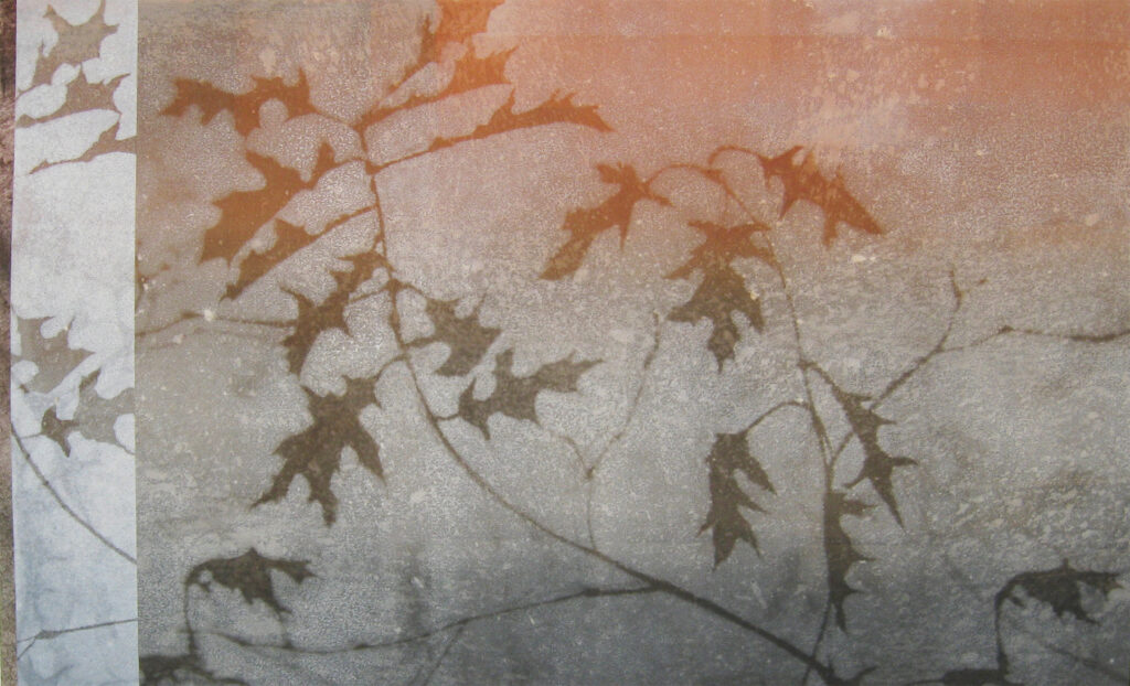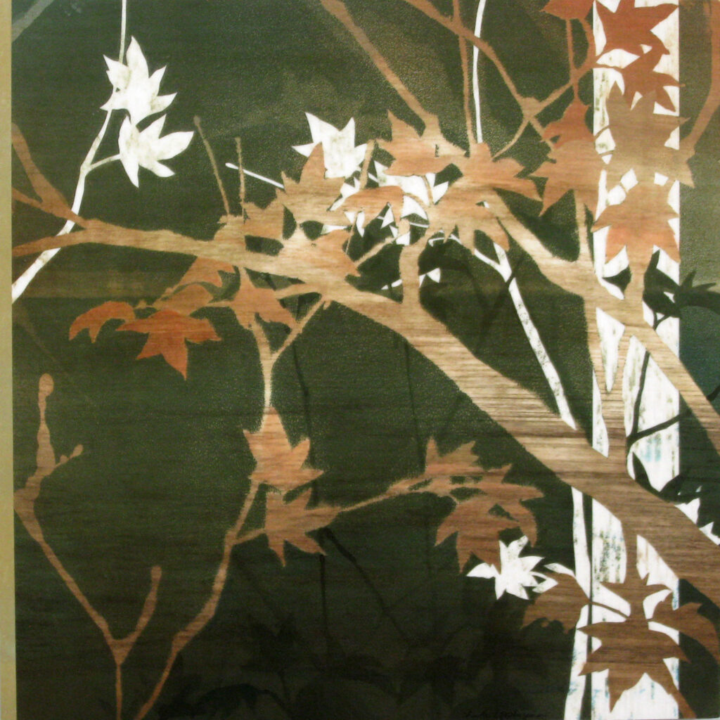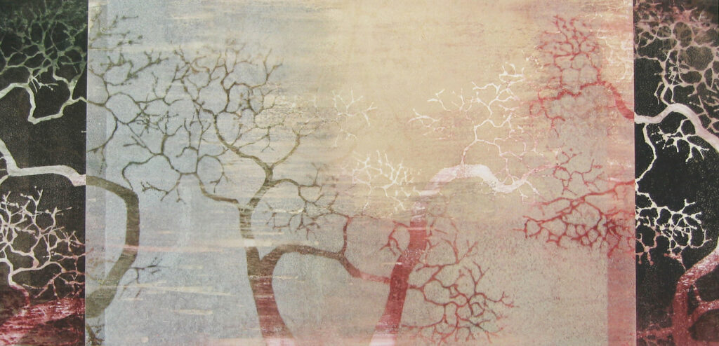 “Kiri-e” means “cut art” in Japanese. These monotypes were glued to a wood panel and parts were cut out to reveal the white paper underneath.