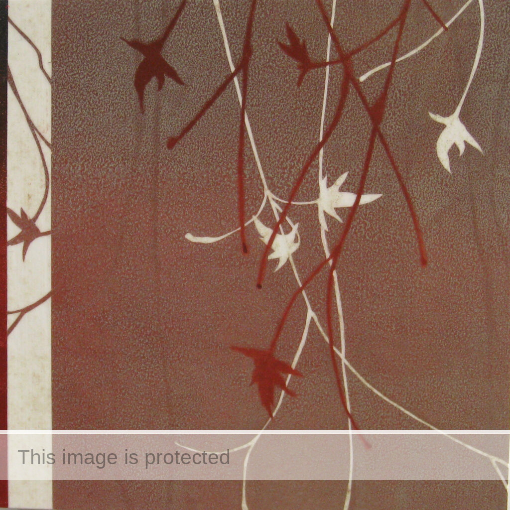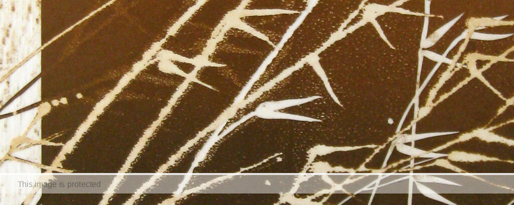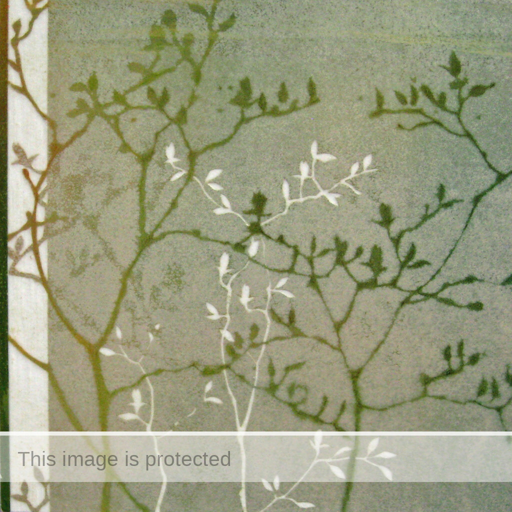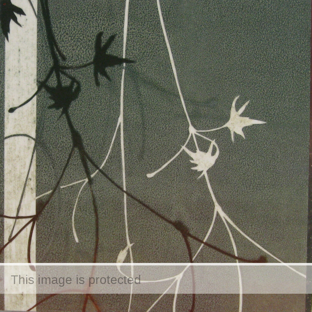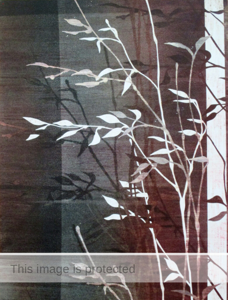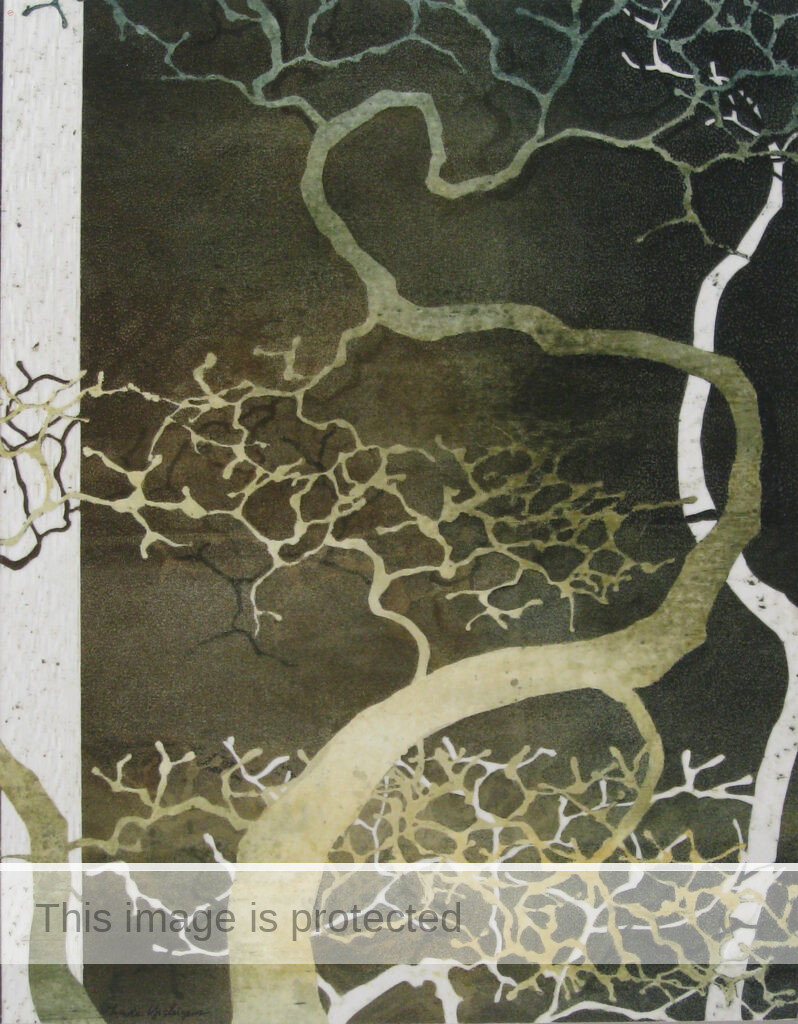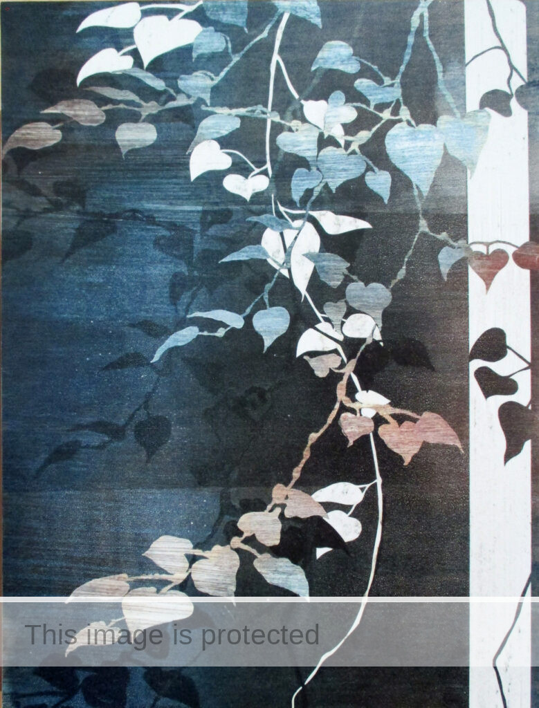 “Kiri-e” means “cut art” in Japanese. These monotypes were glued to a wood panel and parts were cut out to reveal the white paper underneath.